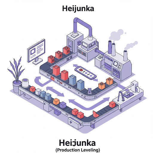 Heijunka (jap. 平準化) oznacza poziomowanie – chodzi o równomierne rozłożenie produkcji w czasie, zarówno pod względem ilości, jak i różnorodności produktów. Zamiast produkować duże partie jednego wyrobu (np. 1000 sztuk A, potem 1000 sztuk B), Heijunka sugeruje produkcję w mniejszych, mieszanych partiach (np. A-B-A-B), zgodnie z rzeczywistym zapotrzebowaniem klienta.